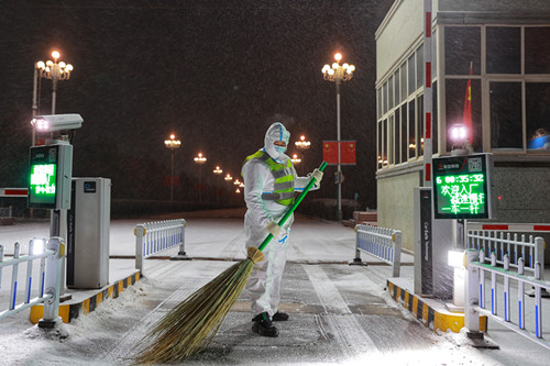 11月6日凌晨,嘉峪關(guān)市漫天雪花飛舞,刺骨寒風(fēng)陣陣,寒潮天氣突然降臨。在疫情防控特殊時(shí)期,保衛(wèi)處職工不畏寒冷堅(jiān)守崗位,認(rèn)真執(zhí)勤、掃雪,保證了疫情防控措施執(zhí)行到位、職工出入順暢通行。圖為該處職工午夜堅(jiān)守崗位。張志方 攝